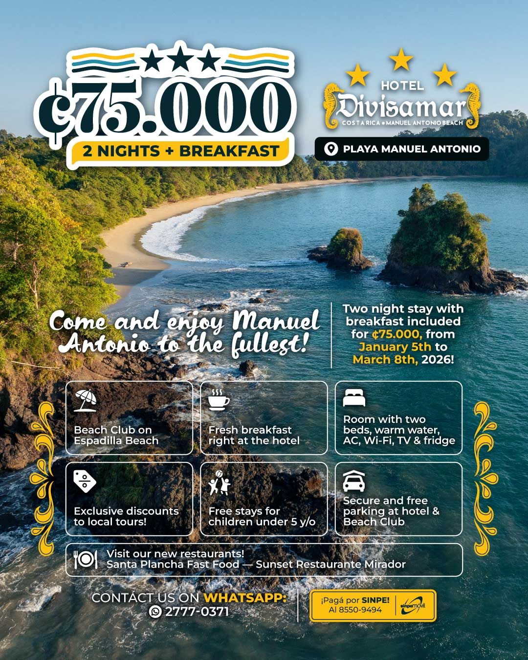 Vom 5. Januar bis zum 28. März 2026 bieten wir Ihnen einen Aufenthalt von 2 Nächten für 2 Personen für nur 75.000 ₡ (Preis inklusive Steuern, maximal zwei Erwachsene).